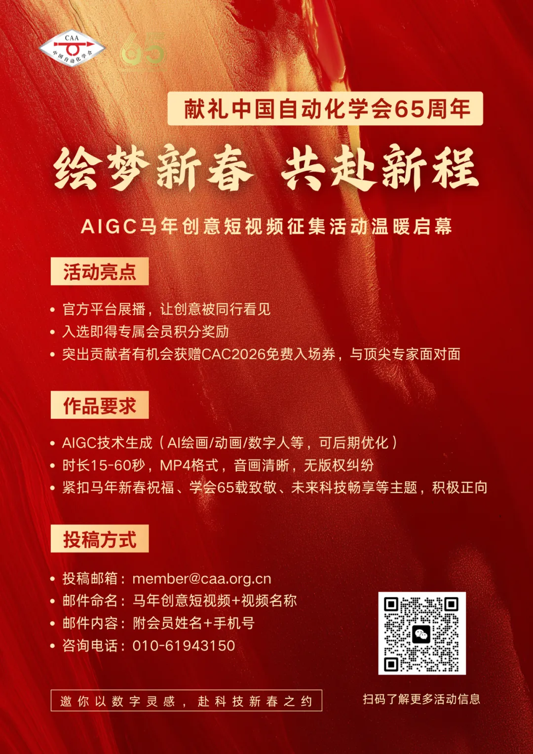 为紧跟新一代人工智能技术浪潮,让 AIGC 成为科技传播的新载体、文化创作的新工具,更鼓励广大科技工作者以年轻化、创意化的表达,展现行业奋斗风貌、传递时代创新精神,畅想未来智能图景,学会特发起本次 AIGC 马年创意短视频征集活动,邀您共赴一场科技与新春的浪漫之约,为学会 65 周年书写专属纪念。