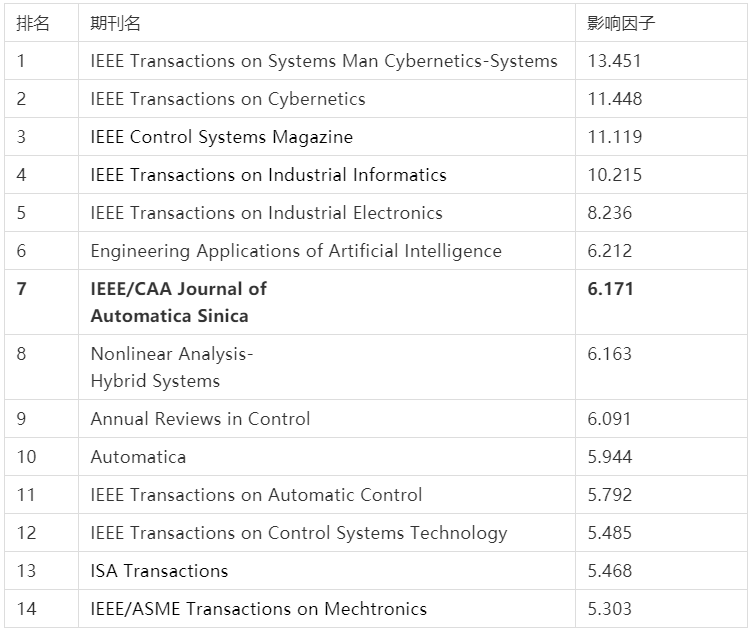 附:自动化与控制系统领域Q1区SCI期刊最新影响因子