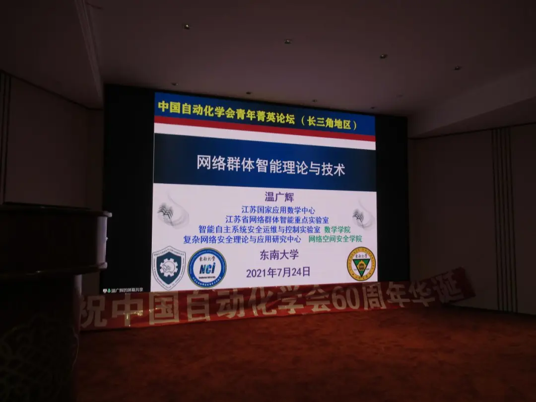 论坛首先由东南大学的温广辉教授带来题为“网络群体智能理论与技术”的学术报告。报告中,温教授介绍了在新一代人工智能研究背景下,网络群体智能理论与技术的研究内涵和外延,并进一步分享一些关于切换拓扑下群体智能系统协同一致性的研究成果,以及相关理论成果在水面无人艇和多旋翼无人机集群系统协同编队控制中的典型工程应用。
