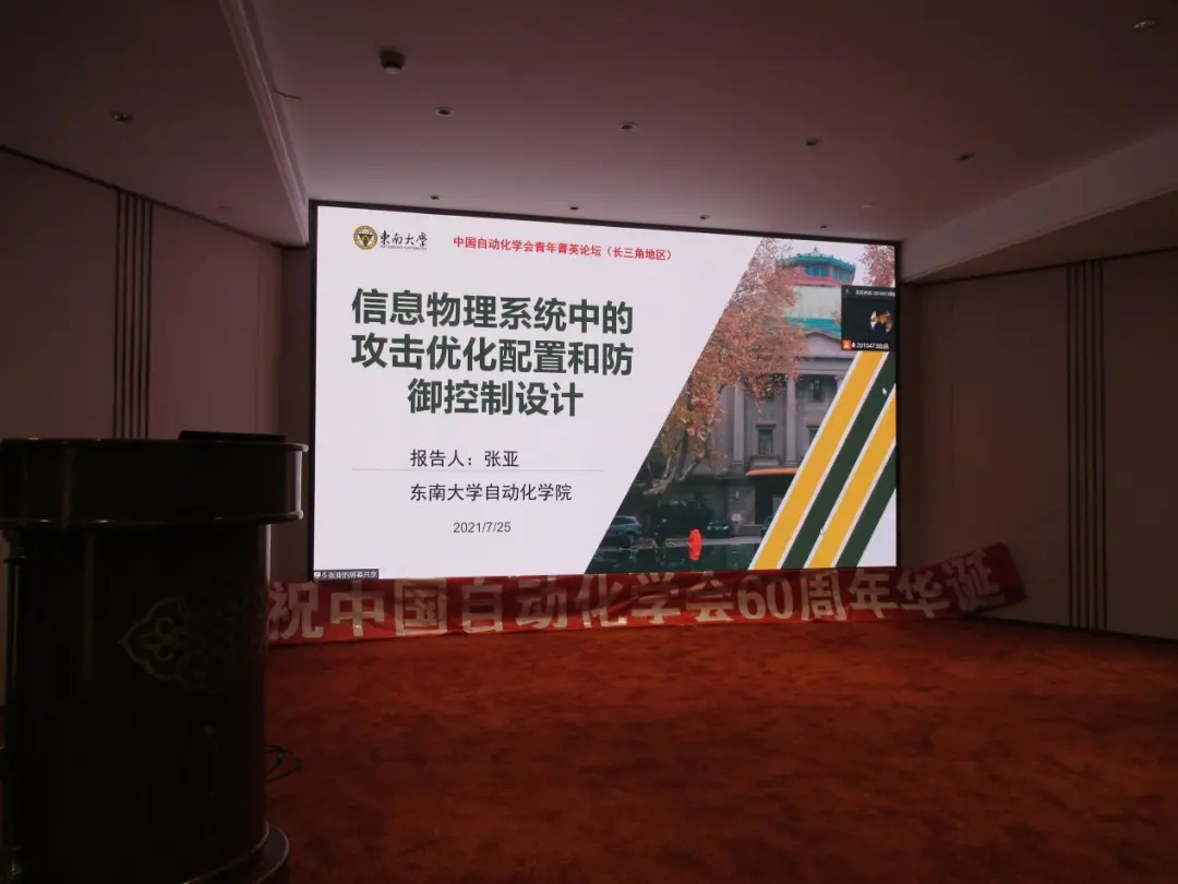 第十六位报告人为来自东南大学的张亚教授。报告题目为“信息物理系统中的攻击优化配置和防御控制设计”。报告分别从攻击者和防御者两个维度,讨论如何优化配置攻击和设计攻击防御控制器,使得在破坏网络协同估计和协同控制能力的前提下使得攻击的能耗最小,同时能够抵御虚假数据注入攻击对信息物理系统稳定性和异构多智能体系统一致性的影响,确保系统的控制性能。