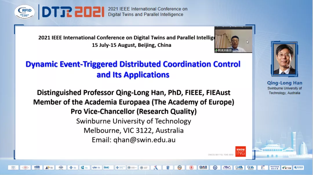 澳大利亚斯威本科技大学副校长和特聘教授韩清龙教授发表关于“动态事件触发的分布式协调控制及其应用”的主题报告,报告中详细介绍了动态事件触发的分布式协调控制的最新研究:在分布式协调控制的背景下引入了动态事件触发调度的动机。然后详细讨论了动态事件触发的分布式协调控制技术的设计和实现问题。并且还举例说明了动态事件触发分布式协调控制在微电网和自动化车辆领域的两种应用。