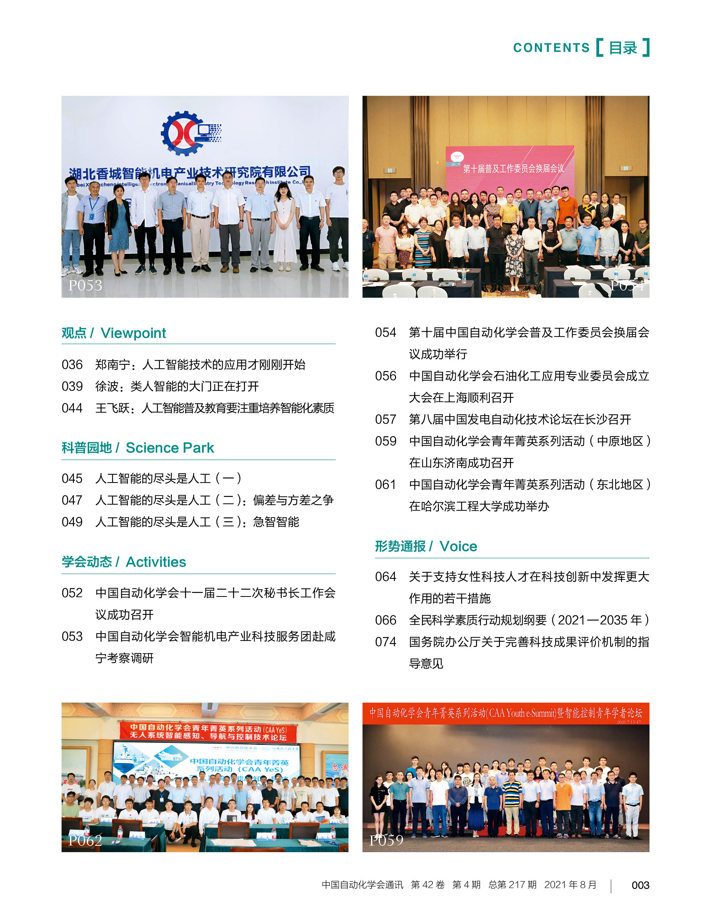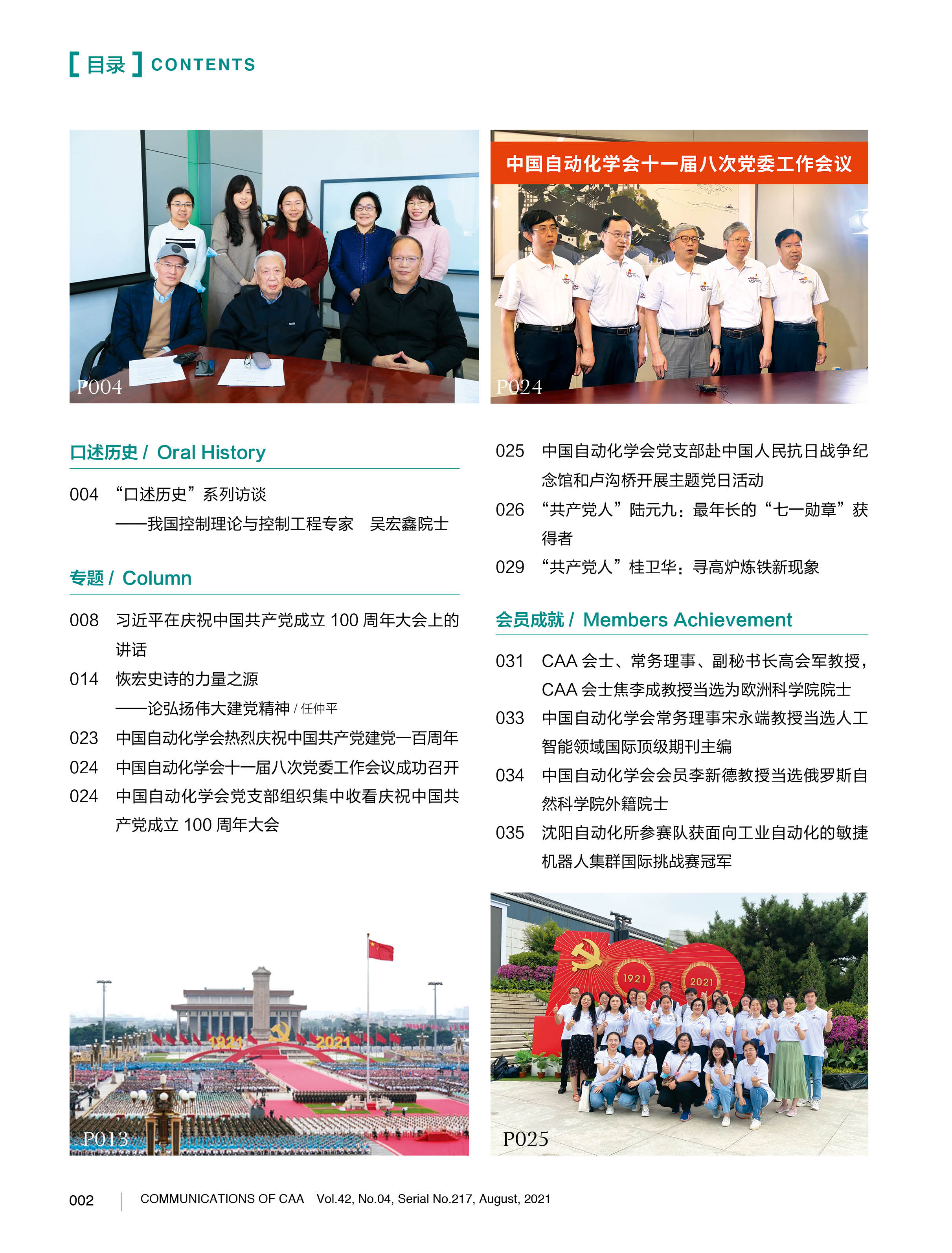 中国自动化学会通讯 2021年8月第4期(第42卷 总第217期)发布,本期专刊汇集了学会庆祝中国共产党成立100周年系列活动。奋斗百年路,启航新征程!