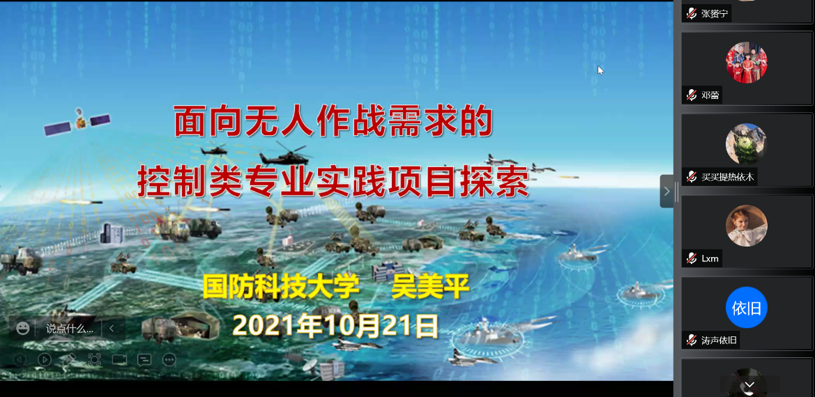 中国自动化学会教育工作委员会副主任委员、国防科技大学智能科学学院院长吴美平教授作题为“面向无人作战需求的控制类专业实践项目探索”的报告。他简要阐述无人系统发展现状;主要分析当前无人作战的主要样式,以及无人系统发展面临的技术挑战;分析机械化信息化智能化融合发展对人才培养的挑战,在此基础上提出现代军官的能力素质要求;分析设计专业课程体系设计,重点分析专业实践项目设计目的、实践内容和实践效果。最后,他展望了“十四五”实践项目建设规划。