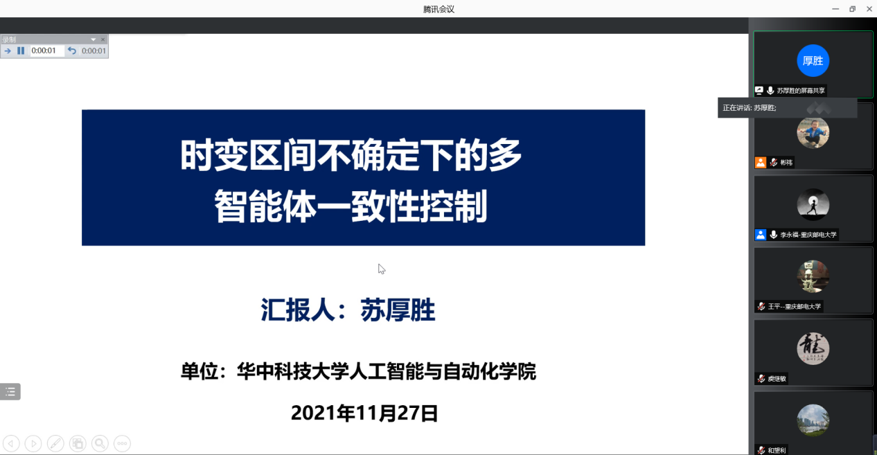 第七位报告人为来华中科技大学的苏厚胜教授,报告题目为“时变区间不确定下的多智能体一致性控制”。报告中,针对具有时变区间不确定性和初始状态未知的连续时间不确定多智能体系统的一致性问题,利用不确定性矩阵和未知初始状态的边界信息设计了局部区间观测器和邻域区间观测器,解决了该系统的鲁棒一致性问题。最后,通过数值仿真验证了其理论的有效性。