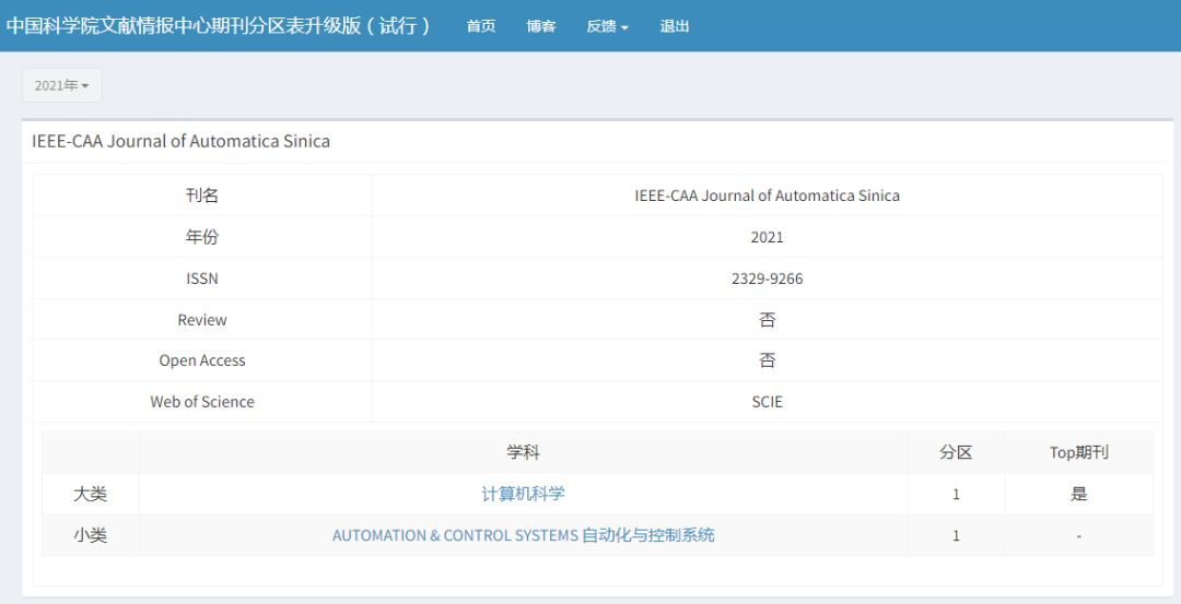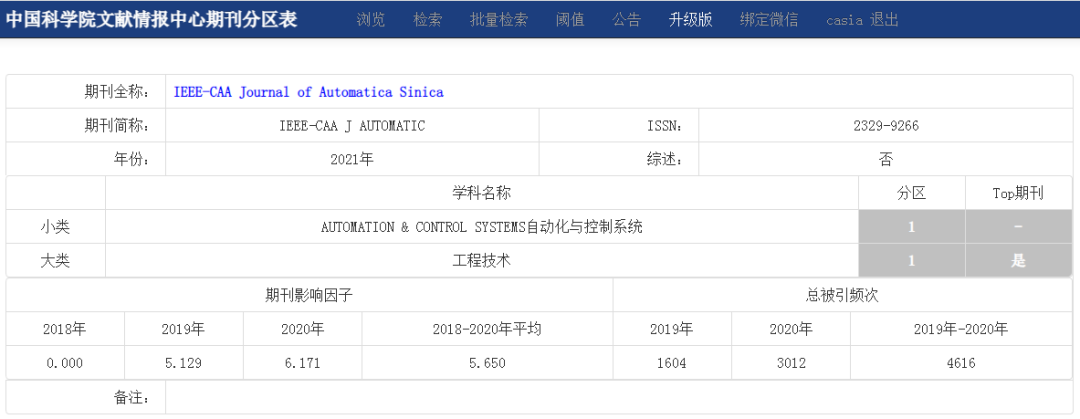 今天,《2021年中国科学院文献情报中心期刊分区表》(下简称中科院分区表)正式发布,IEEE/CAA Journal of Automatica Sinica在工程技术学科大类、计算机科学大类(升级版)、以及自动化与控制系统学科小类均首次进入1区,成为工程技术学科大类和计算机科学大类的Top期刊。