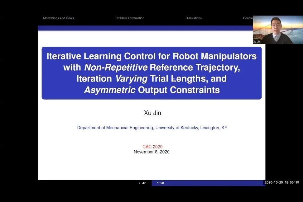 最后,美国肯塔基大学金旭助理教授通过视频做了“ILC for Manipulators with Non-Repetitive References, Varying Trial Lengths, and Asymmetric Output Constraints”的专题报告。报告提出了一种新的迭代学习控制(ILC)方案,以解决机器人在不同试验长度的迭代域上的非重复参考轨迹跟踪问题,同时考虑到关节角不对称的约束。为了解决迭代长度变化的问题,给出了一种新的迭代学习控制律结构,即基于复合能量函数的迭代学习控制律,介绍了一种新的处理关节角度约束的通用势垒函数。最后,通过一个二自由度机械手的例子对所提方法进行论证并对该研究方向予以展望。