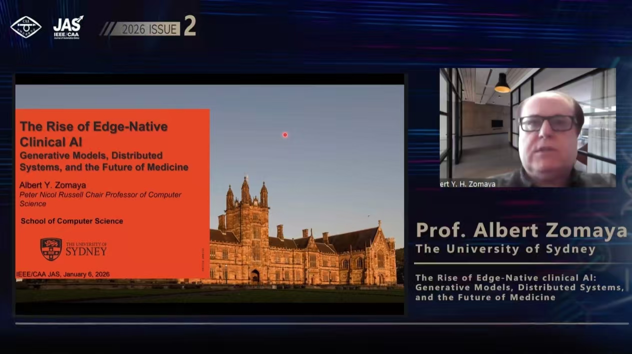 2026年1月6日14:00(北京时间),中国自动化学会(CAA)与 IEEE/CAA Journal of Automatica Sinica(JAS)联合主办的2026年第1期(总第2期) JAS 杰出讲座(IEEE/CAA JAS Distinguished Lecture)成功举办。澳大利亚悉尼大学Albert Y. Zomaya教授以“边缘原生临床人工智能的崛起:生成式模型、分布式系统与医疗未来”(The Rise of Edge-Native Clinical AI: Generative Models, Distributed Systems, and the Future of Medicine)为题进行主旨演讲。本次讲座通过学会视频号、B站、知乎、抖音以及新华社、网易科技等平台面向全球同步直播,吸引了近40万名海内外专业学者、科研人员及高校学生线上参与。