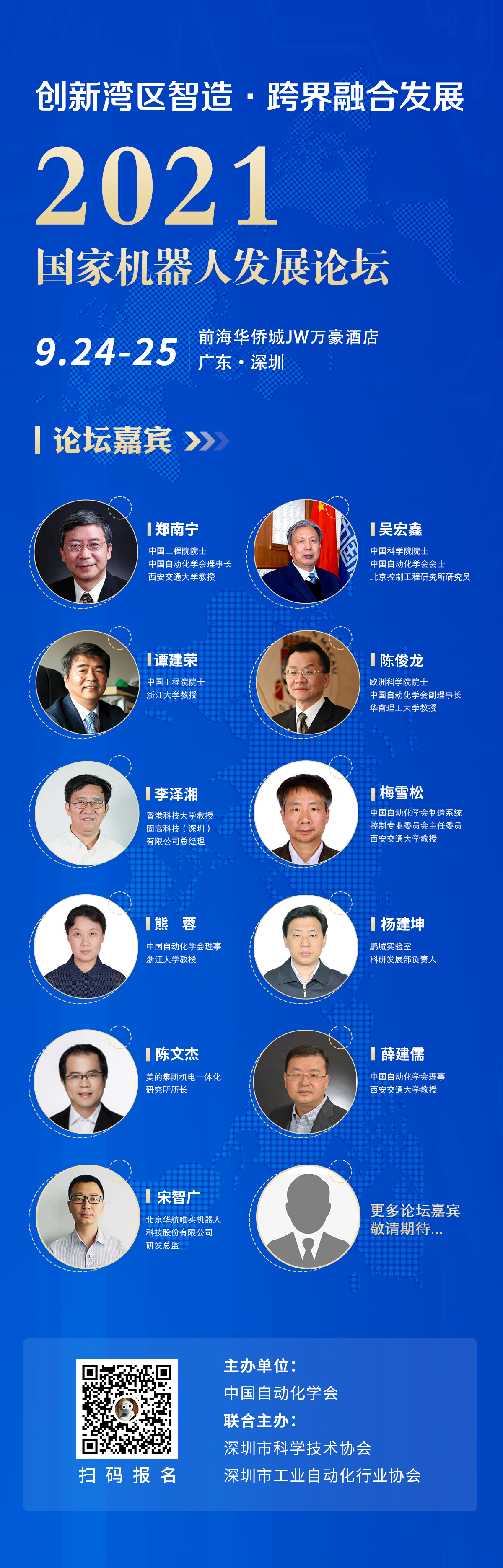 2021年是我国“十四五规划”的开局之年,为响应中国科协关于开展“科创中国”品牌工作的号召,促进我国智能机器人理论研究、技术创新和成果转化,推动机器人新技术创新应用发展,增强自主研发水平和实际应用能力,联合产学研用各界,促进当地科技成果转化,助力产业升级发展。中国自动化学会联合深圳市科学技术协会、深圳市工业自动化行业协会主办的“2021国家机器人发展论坛”将于2021年9月24-25日在深圳举行。