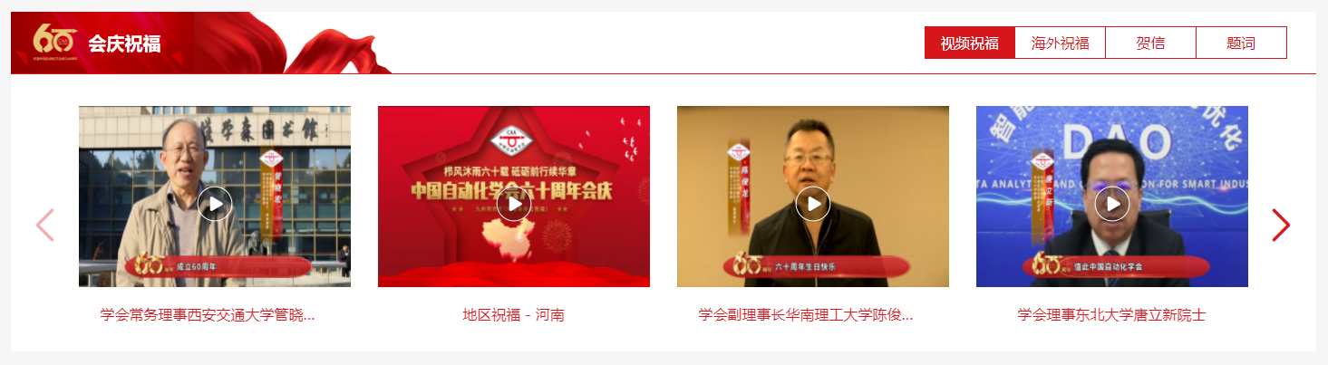 会庆祝福一栏以视频、贺信、题词等形式汇聚了高校、研究院、企业等社会各界对学会表达的热爱与祝福,对60年华诞的感慨与祝愿。