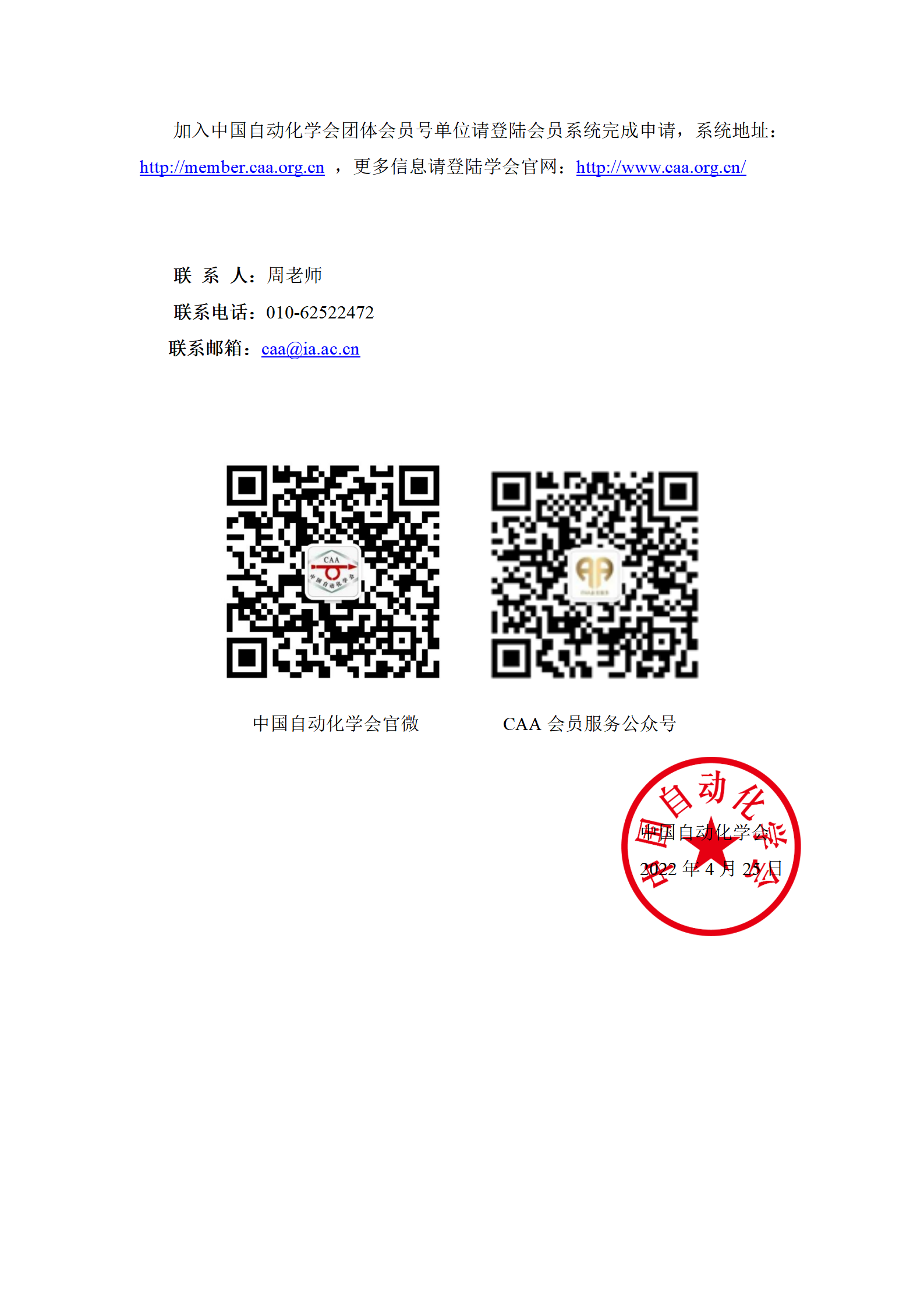 加入中国自动化学会团体会员号单位请登陆会员系统完成申请,系统地址:http://member.caa.org.cn ,更多信息请登陆学会官网:http://www.caa.org.cn/