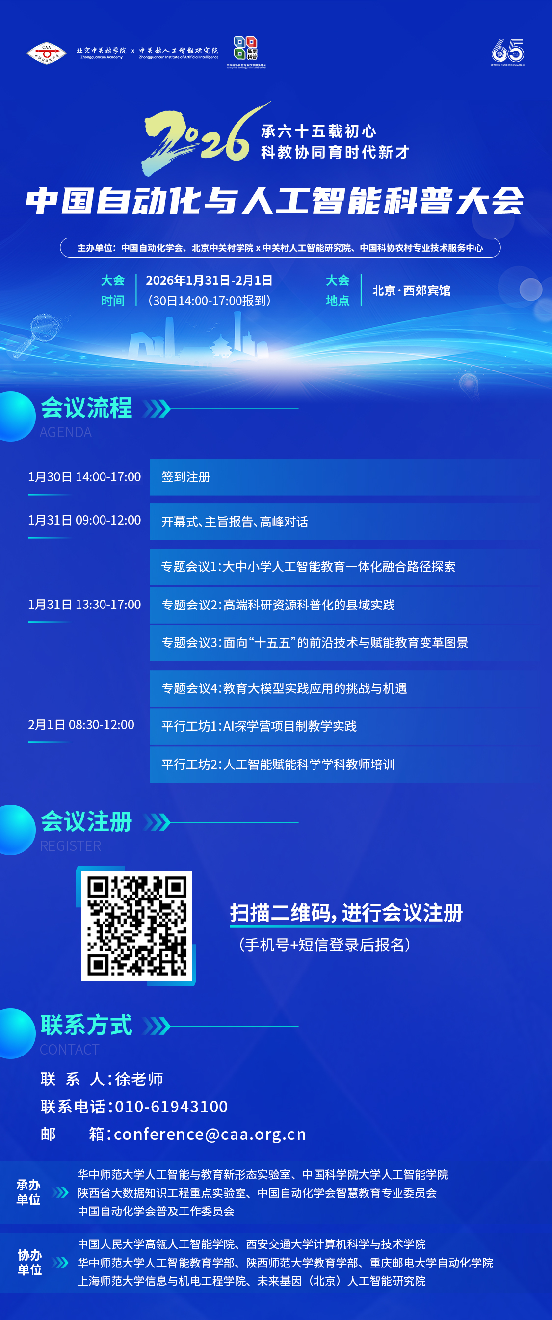 加强中小学科技教育是服务国家创新驱动发展战略、培养未来科技创新人才的重要路径。为深入贯彻党的二十大和二十届历次全会精神,全面落实《教育强国建设规划纲要(2024—2035年)》战略部署与《国务院关于深入实施“人工智能+”行动的意见》战略部署,中国自动化学会拟定于2026年1月31日-2月1日在北京举办2026中国自动化与人工智能科普大会。