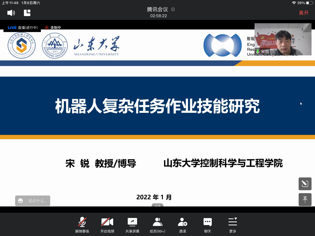 第六位报告人为来自山东大学的宋锐教授,报告题目为“机器人复杂任务作业技能研究”。报告中,宋锐教授主要围绕近年来国内外机器人复杂任务作业技术研究现状,从机器人操作技能学习出发,探讨规划面临的主要科学挑战和关键科学问题并结合部分研究成果,探讨有感当前和未来机器人复杂任务作业面临的挑战和发展愿景。
