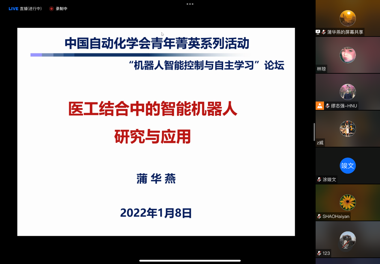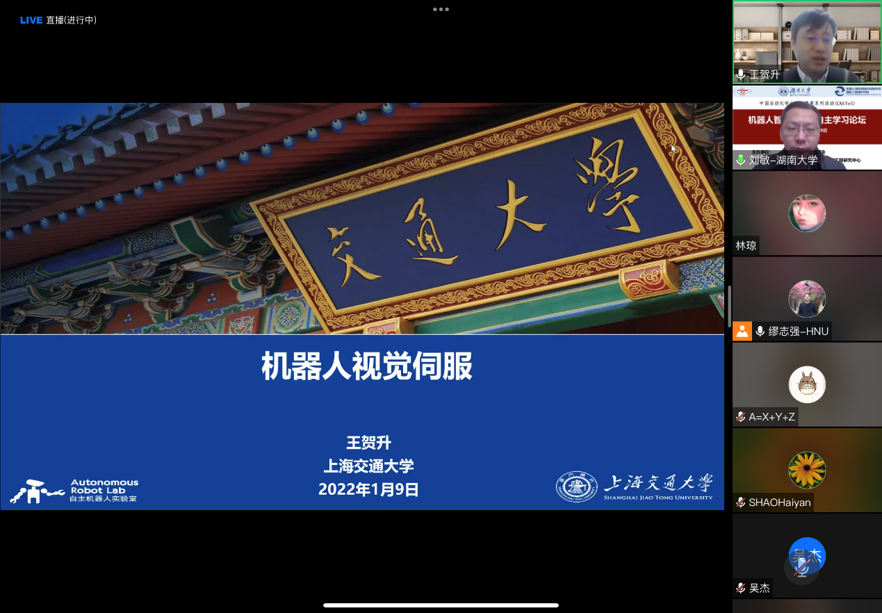 为了推进机器人与自动化等领域的学术交流,由中国自动化学会主办、湖南大学机器人视觉感知与控制技术国家工程研究中心等承办的主题为“机器人智能控制与自主学习”的CAA YeS论坛于2022年1月8日-9日于线上/线下混合形式圆满召开。中国工程院院士,中国自动化学会会士,常务理事,湖南大学机器人视觉感知与控制技术国家工程研究中心主任王耀南院士担任本次论坛主席,湖南大学电气与信息工程学院缪志强副教授担任本次论坛组织主席,湖南大学机器人学院张辉教授担任本次论坛共同组织主席。论坛邀请了25位来自国内外知名高校和企业的优秀科技工作者做主题报告,共同研讨机器人智能控制和自主学习理论和应用等方面所面临的机遇及挑战,线上总参会人数达500多人次。