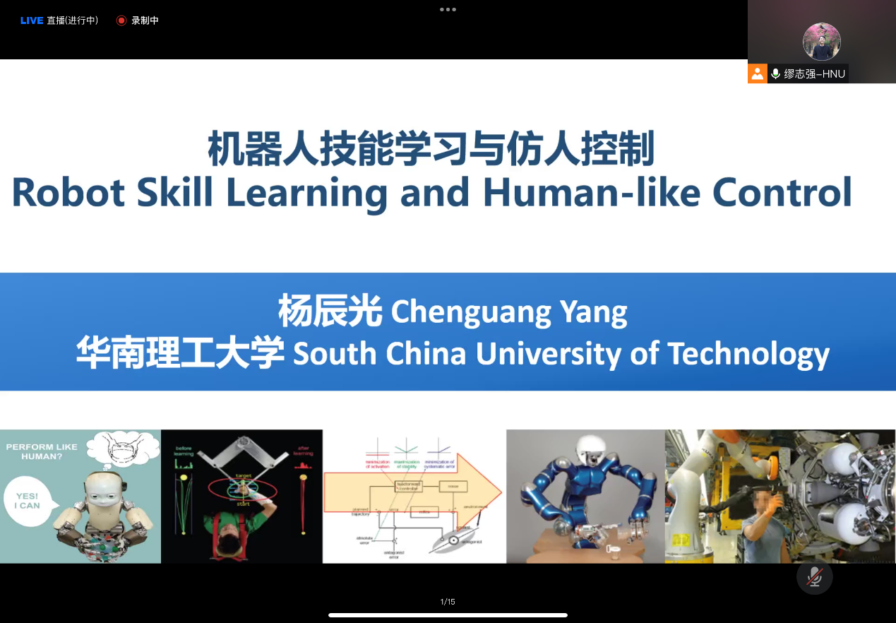 第十二位报告人为来自华南理工大学的杨辰光教授,报告题目为“机器人技能学习与仿人控制”。报告中,杨辰光教授着重从遥操作和人机协作两方面介绍人机共享控制的实际应用场景以及效果,从实时避障、神经网络优化、动态补偿以及肌电信号利用等多个方面对人-工业机器人以及人-移动机器人的新型共享控制技术进行探索与应用。