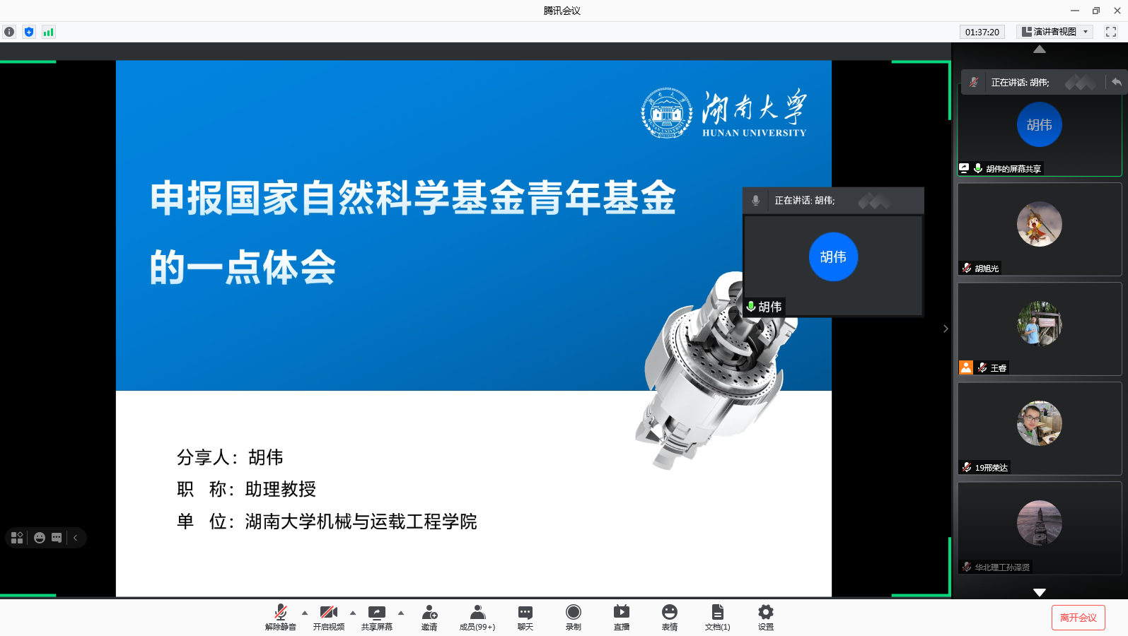 第三场报告由湖南大学胡伟助理教授主讲,做了主题为“申报国家自然科学基金青年基金的一点体会”的报告,从自身实际出发,主要针对青年基金的申请进行了讲解。胡伟助理教授提到在选题过程中,要注重与国际科学前沿、国际重大战略需求及未来发展相结合(选择了能源互联网的重要消费单元电动汽车),表明青年基金的内容要聚焦于一点,突出与别人研究的不同之处。报告的最后,表示欢迎和参会人员就基金申请进行后续交流。