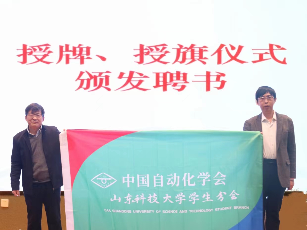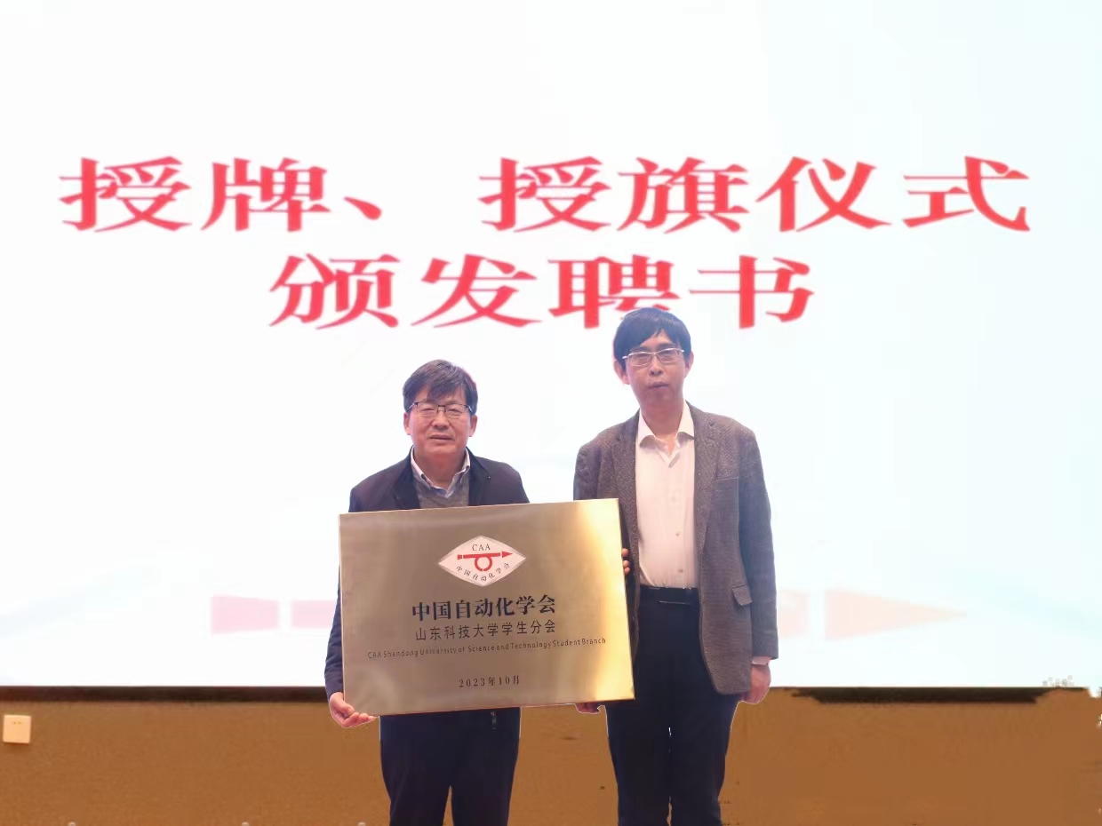 在学生分会选举阶段,全体会员通过无记名投票,选举产生了第一届执行委员会成员。选举结束后,李少远副理事长代表中国自动化学会为山东科技大学学生分会授牌、授旗并颁发聘书。并为第一届指导委员会和执行委员会成员代表颁发了聘书。