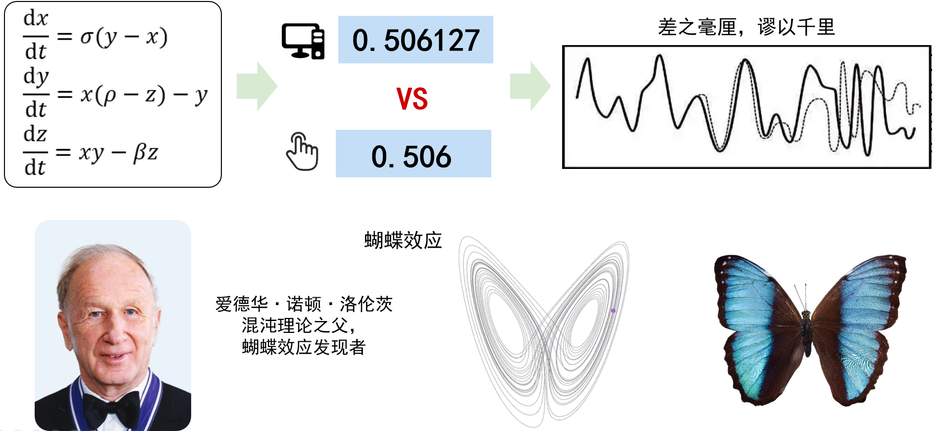 牛顿建立了机械性、确定性的物理王国。像小球从斜面滑下的故事时刻都被牛顿力学牢牢控制。在这个确定性王国里,只要我们给定了系统的初始状态,那万物都将按照确定的规则运行。1961年的冬天,气象学家洛伦茨(Edward Norton Lorenz)构建了一个精巧的数学模型,希望能预测天气,却意外地发现了另一个世界。计算机千分之二的系统误差(0.0001秒)竟会得到截然不同的结果。所谓“差之毫厘,谬以千里”。他把这个高度非线性的天气模型输入到计算机中,得到的状态轨迹竟像一只张开翅膀的蝴蝶。于是就有了大家非常熟悉的蝴蝶效应(如图2所示),这一效应形象地表现了非线性系统对初值的敏感性,也体现了复杂系统一个有趣的现象——混沌。
