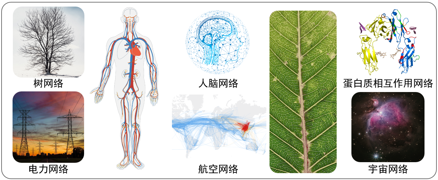 圣塔菲研究所的创始人之一乔治·考温曾说,他们正在开创二十一世纪的科学。如今,未来已来!经过科学家们三十多年来的努力,如今复杂科学又迎来了一个新发展阶段——应用复杂网络来刻画、研究复杂系统。网络科学应运而生。网络科学的核心思路,就是应用复杂网络对各类复杂系统进行建模[2]。在现实世界中,大到全球生态系统和全球物流系统,小到细胞内的蛋白质交互系统,都可以用复杂网络进行建模(如图3所示),其中节点表示系统的组成元素,连边表示元素之间的相互作用,通过研究系统抽象而成的网络结构及其上的动力学,就可以理解网络所对应的复杂系统的规律。