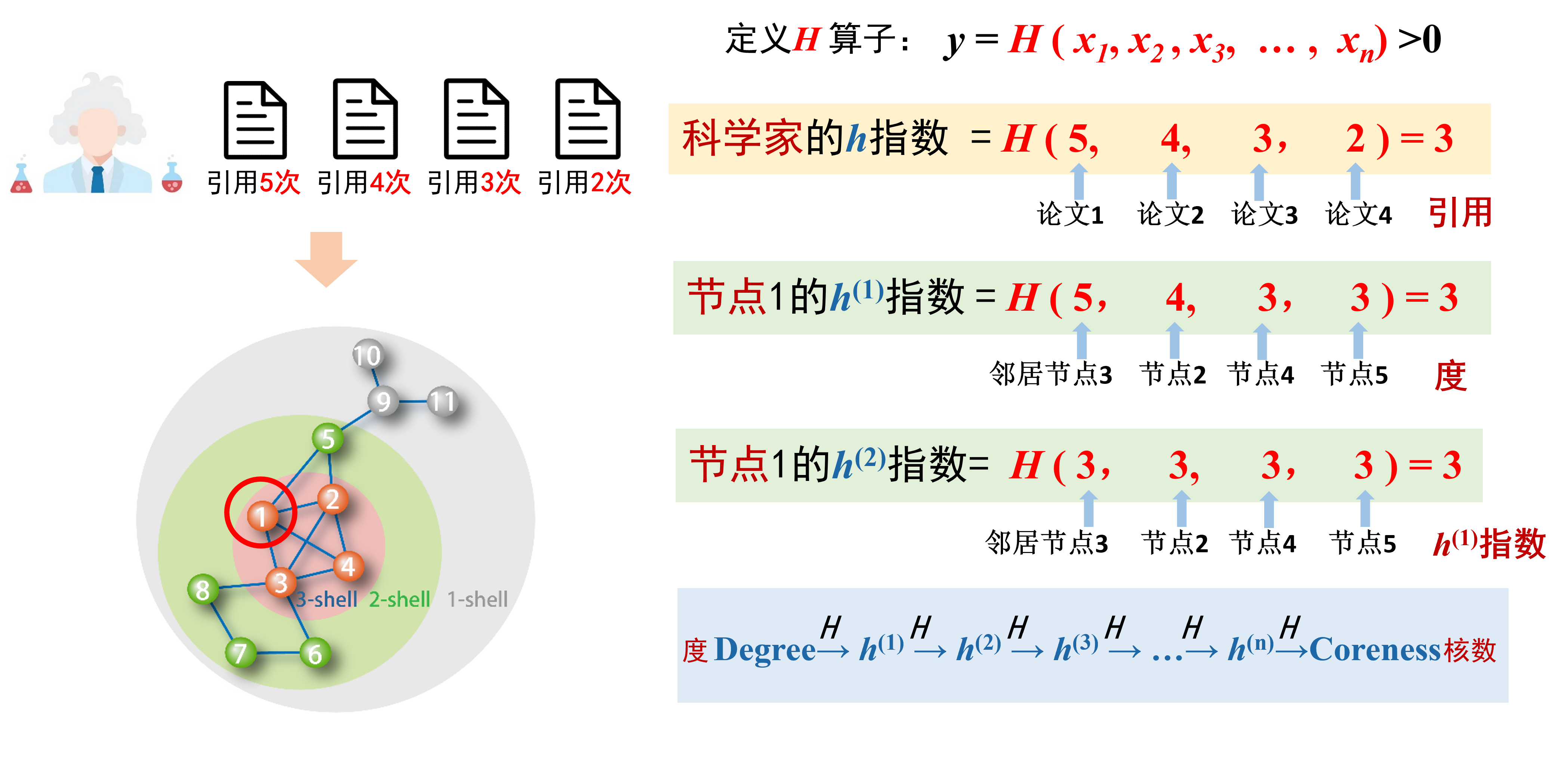 受到科学家H指数的启发,我们定义了一个局部H算子[6],将算子H作用在有限的实数序列上,得到y=H(x1,x2,...,xn)。H算子的定义为在实数序列(x1,x2,...,xn),最多找到y个不小于y的数(如图5所示),这个概念与H指数的概念完全一致。当我们把H算子作用在网络的节点度序列上时,返回的y值就称为该节点的一阶H指数,将H算子进一步作用在某节点的邻居的一阶H指数上时,可以得到该节点的二阶H指数。经过这样连续的作用,就能得到节点的H指数序列。有趣的是,这个序列可以被严格证明为收敛于节点的核数。