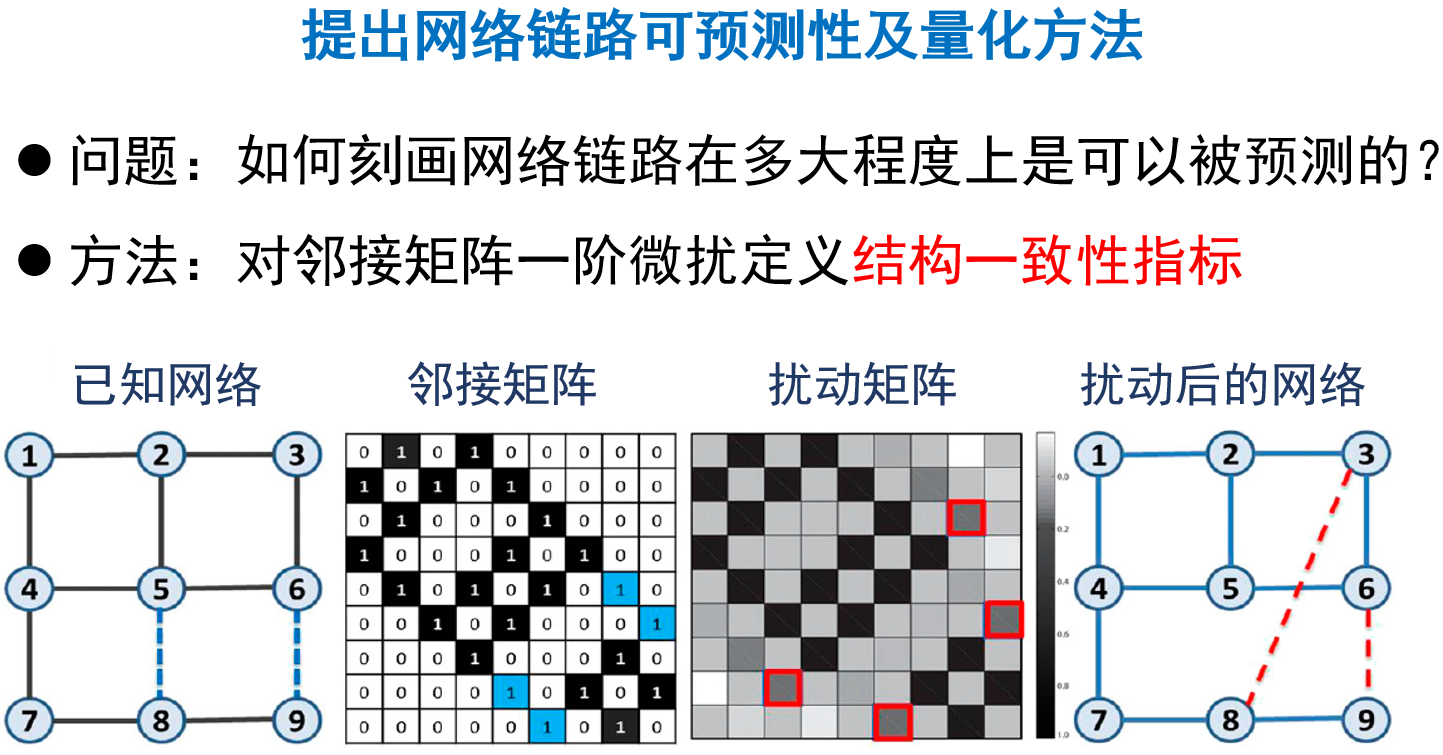 我们认为,如果随机从网络中抽取出一小部分链路,网络的特征向量空间受到的影响很小,就说明网络是具有规律性的,即可预测性高的。在这种思路的基础上,我们应用类似于量子力学中对哈密顿量做一阶微扰的方法,假定减少或者加入少量链接所产生的微扰,只对特征值有影响,而对特征向量没有影响,这样就可以观察微扰后通过这种办法重构的邻接矩阵和真实邻接矩阵的差异。我们提出了一个度量这种差异的指标——网络的结构一致性[10]。一致性越强则表示该网络的可预测性越大。依据这个思路,我们进一步提出了基于网络结构微扰的链路预测模型(如图7所示)。这个方法在预测丢失的链路以及甄别网络中添加的噪音边两方面都明显超过了经典的层次结构模型和随机分块模型等等。相关算法不仅可以用在社交领域的关系预测中,还可以用在乳腺癌、肺癌、心衰等多种致病基因的预测,预测精度高于传统的系统生物学方法[11]。