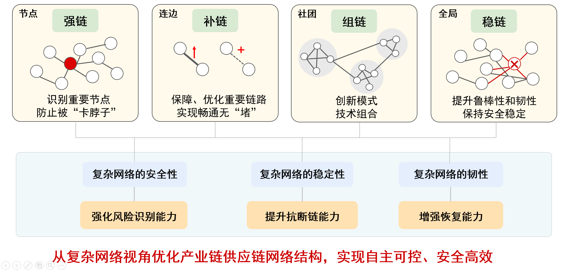 网络信息挖掘具有非常广泛的应用场景。目前已有部分研究成果应用于网络舆情监控、致病基因预测、医保欺诈识别、电子商务服务等实际系统中,产生了一定的社会经济价值。二十大报告中强调了产业链供应链对于国家安全的重要性,要求着力提升产业链供应链韧性和安全水平,网络信息挖掘的相关方法也能应用于相关研究中发挥作用。产业链供应链天然就是一张网,可以用复杂网络进行描述刻画(如图8所示),其中供应链是上下游企业为实现将产品或服务交付给最终用户而形成的产-销关系网络,产业链是各产业之间依据一定经济技术联系、空间布局形成的相互关联网络。通过构建网络,就可以通过识别重要节点,提前发现可能被“卡脖子”的产业;通过识别重要链路,优化重要链路及提前预警薄弱环节等,结合从微观节点到宏观网络全局的视角,提出产业链供应链的优化升级策略,保障产业链供应链的自主可控和安全高效。
