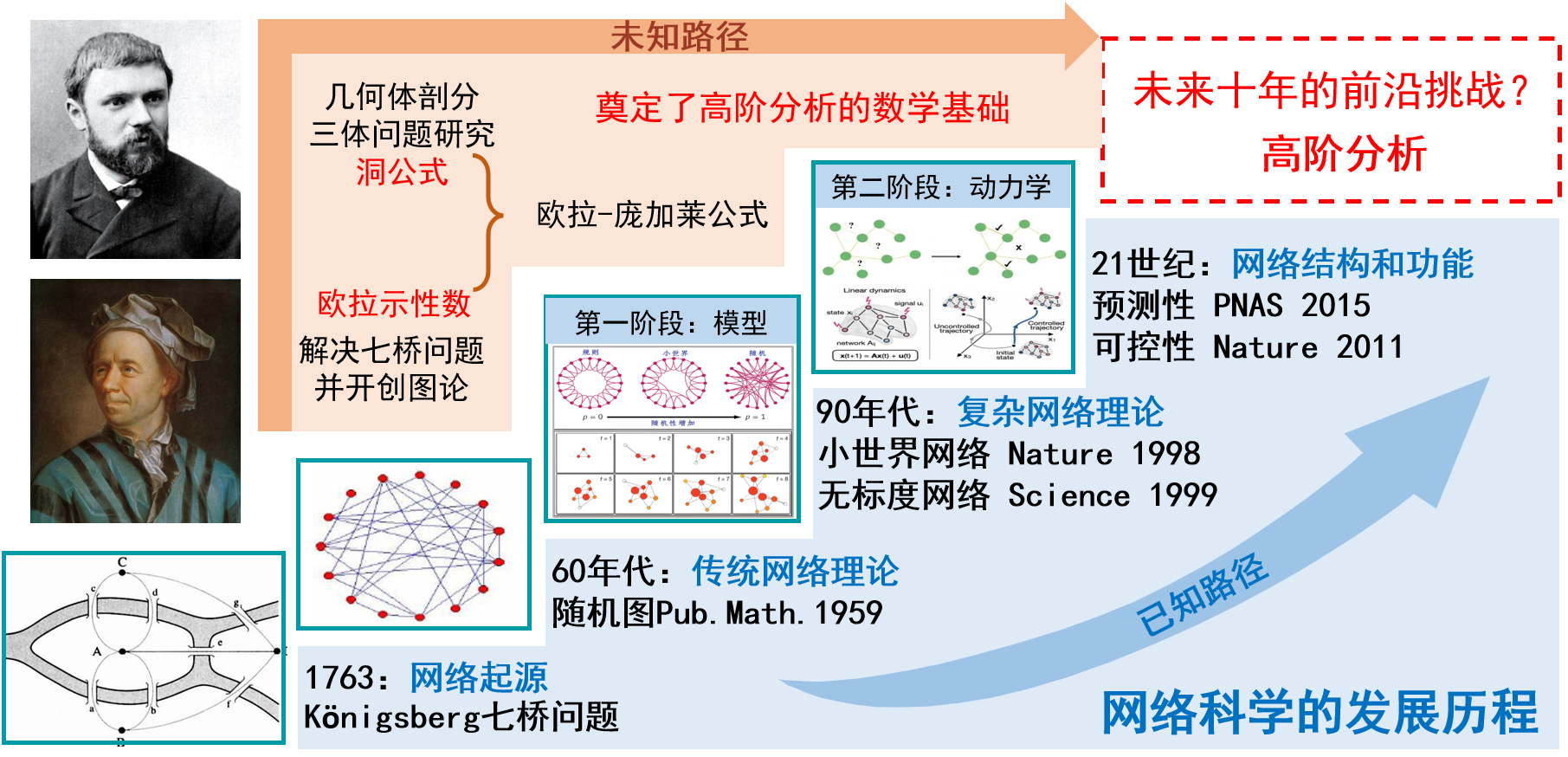 图论作为复杂网络的重要基石之一,其源头最早可以追溯到欧拉的哥尼斯堡七桥问题。直到1998年小世界网络、1999年无标度网络的突破性进展,掀起了网络科学过去二十多年的研究热潮。目前,我们在节点和连边层面对网络的结构、动力学、预测和控制有了较成熟的理解。然而随着研究的不断深入,研究人员发现很多现实系统中不仅包含节点对之间的二元关系,还包括以群、组的形式发生的高阶相互作用[12],比如,一篇学术论文可能是由多名学者共同完成的;生物信号传递、基因表达调节等生命过程需要多种蛋白质的参与;在大脑神经网络中,包括记忆在内的很多认知功能,都依赖于神经元群的编码和信号同步。这种高阶相互作用难以用基于二元交互关系的网络进行很好地描述。当我们回溯网络科学的起源时,会有一些新的思路(如图9所示)。我们发现,欧拉另外一个重要贡献——欧拉示性数以及庞加莱的洞公式等研究为网络科学提供了新的思路,可以用来研究多节点相互作用的高阶结构和动力学问题,从而将网络科学的研究推进到高阶网络分析的时代。高阶网络分析使我们可以获得对网络的结构和功能更深刻的洞见,并有望在一些已有难题上突破瓶颈、获得新发现。