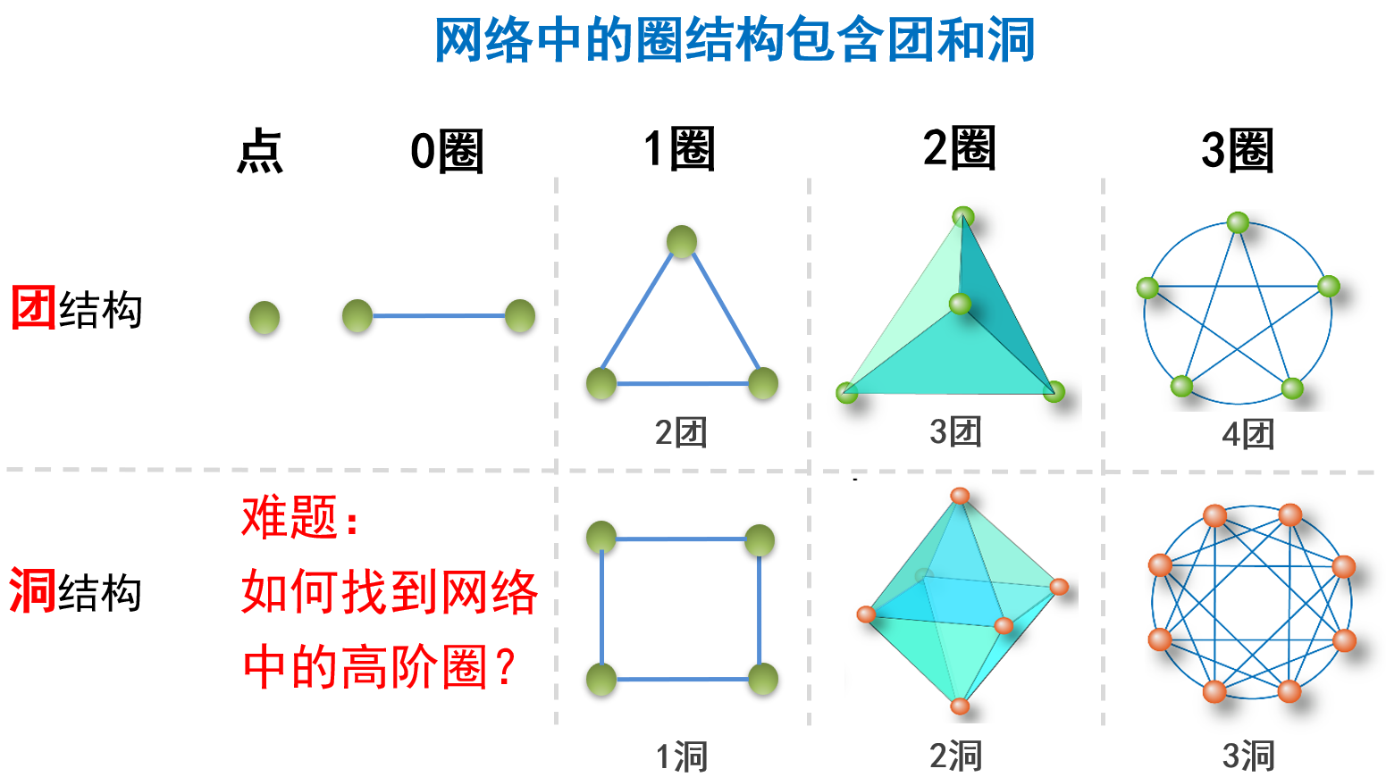 从社会过程到神经科学的众多复杂系统实例上,高阶拓扑分析都展示出了巨大潜力。网络高阶结构中,最基本的就是圈结构,包括团和洞(如图10所示)。而人脑中团和洞,前者作为信息处理和记忆的单元,后者作为跨脑区信息整合和分发的功能基础,对于人脑的并行处理与高级认知活动至关重要[13]。进行网络高阶拓扑分析的首要任务是要找到网络中的高阶结构。但目前为止,关于网络高阶结构的研究还没有形成系统的理论方法。比如绘制大脑完整的高阶结构图谱现在仍是一个巨大的挑战。
