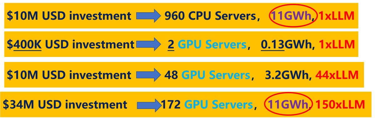 英伟达公司今年5月宣布了"Hopper"计划,旨在分析当前的GPU技术。该计划旨在推动GPU技术的发展,以满足不断增长的计算需求,尤其是在人工智能和科学计算领域。计划的一部分包括推出基于新架构的GPU产品,以提供更高的性能和效能。这将有助于满足日益增长的计算要求,帮助研究人员、科学家和工程师在各个领域开展创新性的工作。该计划启动时,国内尚未受到美国的限制,但它给我们带来了一系列未来发展的思考。回顾早期CPU技术,特别是在大型语言模型的训练方面,以ChatGPT为例,实现这一目标需要巨大的计算资源。然而,借助GPU计算中心资源,成本约为40万美元,能源消耗也仅相当于传统CPU的约1/8。若投入1000万美元,我们能够实现4倍LLM(Large Language Model)大语言模型的规模。进一步考虑到能源消耗,我们甚至可以实现高达150倍LLM的容量,如图1所示。