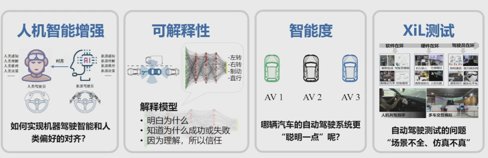 我们团队在汽车智能技术方面的工作涵盖多个方面,如图4所示。首先是人机智能增强,包括机器对人类驾驶员的增强以及人对机器的增强,以期提升自动驾驶汽车的智能水平,实现机器驾驶与人类偏好“对齐”。其次,探索深度学习智能驾驶算法的可解释性,确保驾驶决策的可靠性和安全性,以及评价不同等级自动驾驶汽车的驾驶智能度。最后,针对自动驾驶测评难题,创新了耦合多要素极限特性的实物在环高可信推演技术,自主研制了“软件在环-硬件在环-单车在环-多车在环-实车在环”全链测试工具。这些研究旨在推进智能驾驶技术的发展和安全应用。