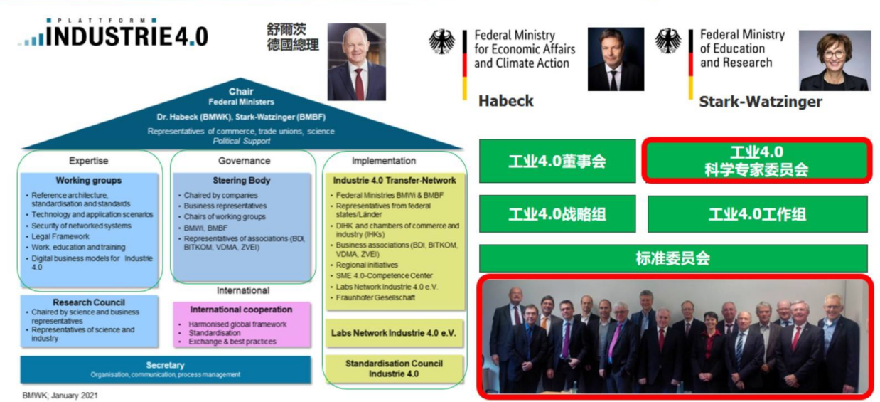工业物联网平台是我们与德国合作的重要项目,尤其与德国的工业4.0平台密切相关。在推动智能制造和工业4.0的进程中,德国采取了一项重要的举措,即成立了由国家两个部委联合领导的国家级工业4.0平台,如图1所示。这一平台由政府主导,汇聚了左侧的科研机构形成专家委员会,右侧包括一些企业和协会来进行推广和实施。值得一提的是,我们的德国合作方Ander院士担任专家委员会的首席科学家。