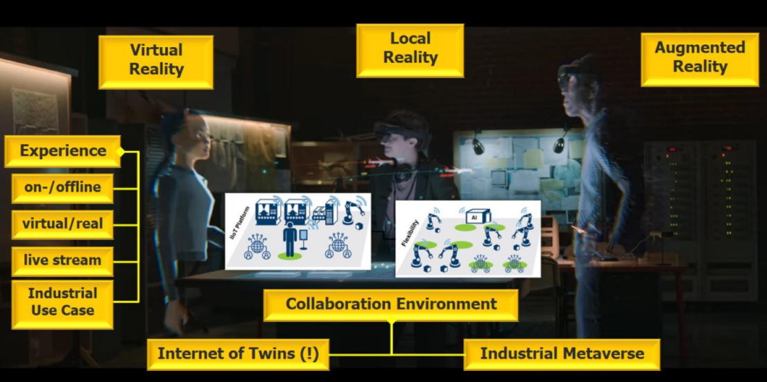 图6是微软在2021Ignite大会上发布的宣传片,场景中,有一位现场工作的员工,还有一位佩戴AR眼镜的同事和一位佩戴VR眼镜的同事。这两位同事的图像可以在现场工作的员工的AR眼镜中呈现出来,他们共同协作进行飞机轨迹规划等任务。该场景具有以下特点:既有线上成分,也有线下成分;既有虚拟元素,也有现实元素;并且是通过实时通信的合作方式来实现。值得注意的是,尽管这是一个创新性的应用,但实际上,微软等公司还没有将这种概念性宣传片转化为实际产品。