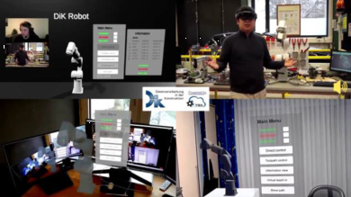 相反的,在“虚”控“实”的过程中,通过网络,实际实体会进行相应的运动。这是一个虚拟控制实际的过程,说明了数字孪生的双向性。图7是同事在家中使用AR眼镜,通过在空中点击这些面板来进行控制和合作。整个过程他们通过Zoom会议进行连接,这使得四位同事可以在不同地点,同时进行虚拟和现实的合作。这基本实现了微软所倡导的全球远程协作的过程,通过数字技术打破地理障碍,实现高效的协同工作。