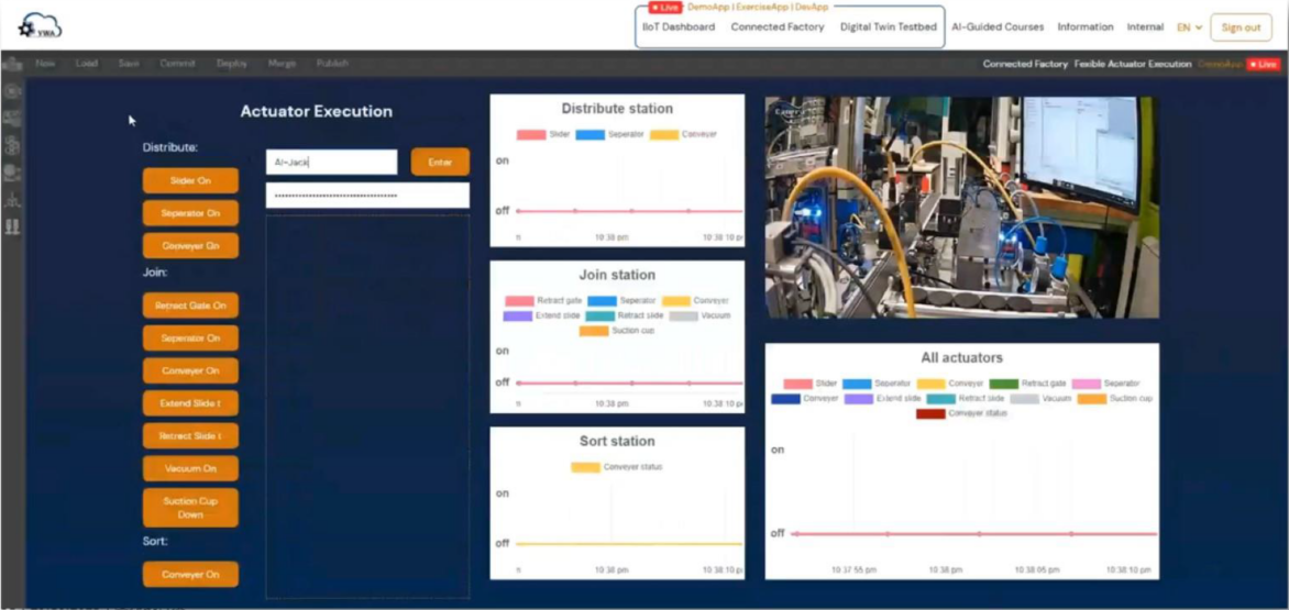 图8底部的动画显示了一个实际的生产线。然而,在这个实际生产线内,仍然可以看到虚拟模型,这个虚拟模型可以在实际的生产线上移动,对实际零件进行操作,并进行虚拟装配。所有的操作步骤都通过云平台进行,因此可以在世界上任何位置,通过网络来实现。此外,当前的界面是云平台的网络界面。除了数字孪生的反馈和视频之外,还可以查看每个执行器的状态。例如,在这里,列出了分拣装置和其他所有执行器的开关情况,也可以视为一个简单的MES系统。这种整合数字孪生和实际生产的方式具有巨大的潜力,可以提高生产效率和质量,同时提供全球范围内的远程监控和协作。