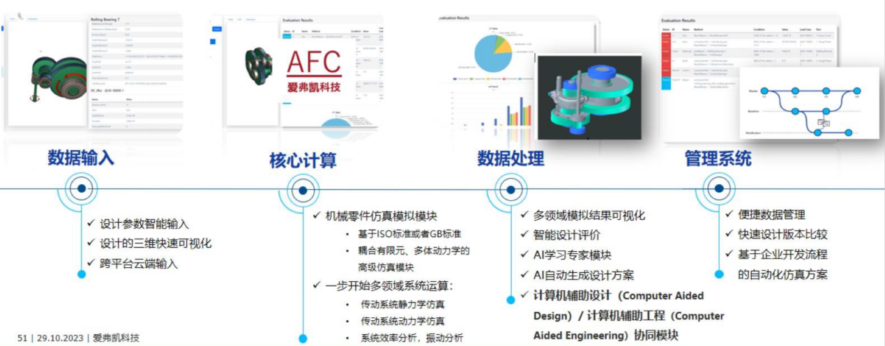 该工业软件基于ISO国际标准,能够耦合有限元模型和多体动力学模型,以进行系统内机械零件的仿真分析。用户可以轻松进行传动系统的静力学分析、动力学分析,以及系统效率和寿命分析等。该软件提供在线和离线两个版本,图11展示的是在线版本,用户可以通过网址访问软件,自动生成三维模型,输入所需信息进行仿真分析,最终生成所需的报告。此外,用户还可以将在线仿真转移到离线版本,在离线版本中进行全面的动力学和静力学仿真。用户还可以将三维模型导入其他工程软件,进行修改后再将修改后的模型导回到AFC软件,根据新的模型进行仿真,并迅速生成报告,以供工程师使用。