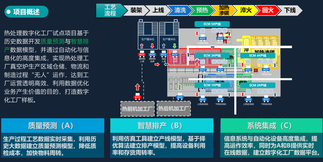 总的来说,该汽车零部件制造公司面临着热处理效率低下、高昂的质检成本和数据流程不透明等挑战。然而,他们拥有五条真空产线、大量传感器和海量数据存储,同时在自动化设备普及率高的环境中,员工素质和对数据的理解也相当出色。在这个基础上,公司提出了ABC三个解决方案来优化工艺装架、上线、清洗、预热、加碳和淬火等流程,如图6所示。利用历史数据进行质量预测,智能排查问题,结合AGB技术实现了无人化工厂。
