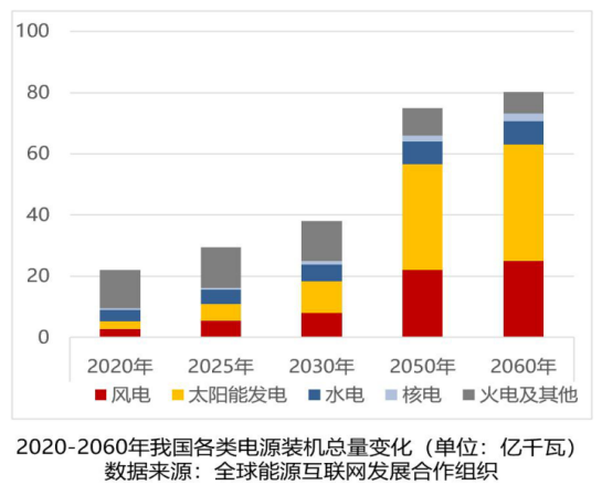 2020年9月,总书记提出了“双碳”目标,包括碳达峰和碳中和,这是应对气候变化和减少碳排放的重要承诺。实现碳达峰相对较容易,可通过到达峰值后减少碳排放来实现,但达到碳中和则更具挑战性。要实现碳中和,必须大力发展可再生能源,其中包括光伏和风电等清洁能源。中国制定了针对大型风电和光伏基地的规划布局方案,特别侧重于沙漠、戈壁和荒漠地区,计划到2030年规划建设风光基地总装机约4.55亿千瓦。如图1所示,根据相关权威机构的预测,为在2060年实现碳中和,风电和太阳能发电总装机将需要达到60亿千瓦,装机占比近80%。截至今年9月底,全国发电装机总容量达27.9亿千瓦,远远超过中国目前最大负荷,其中,风电和光伏装机容量合计达到9.2亿千瓦。因此,在这一背景下,风电、光伏装机保持快速增长的同时,未来对储能技术的需求将继续增长,以更有效地管理可再生能源并确保电力供应的稳定性。