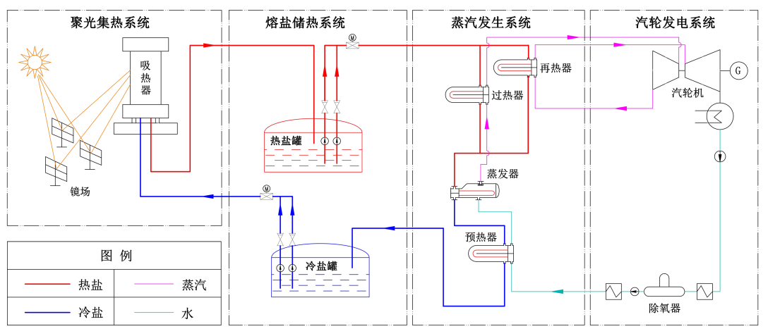 图3是一个经过简化的塔式光热发电工艺流程图,从右到左依次展示了各个部分。最右侧是传统的汽轮机,经过必要的简化处理。最左侧是进口处的聚光集热系统,用来将低密度的太阳光聚焦,将其转化为高温热能。在中间部分是熔盐储热系统,其中包括两个盐罐,一个是低温罐,另一个是高温罐。这个系统产生高温高压的蒸汽,其参数通常在13.7MPa、545℃左右。