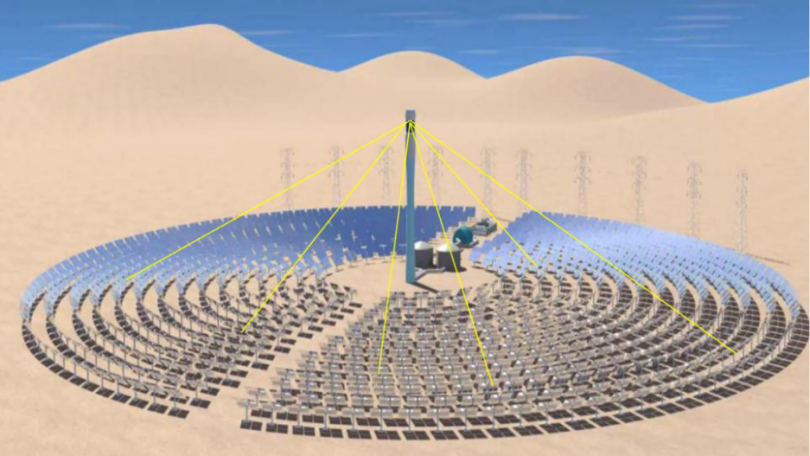 第一代光热发电技术类似于家用太阳能热水器,其基本原理是在抛物面凹槽的焦点处安装一个集热管,用来高效聚焦太阳能热量。第二代光热发电技术如图2所示,一般太阳能热水器的聚焦倍数较低,通常不超过80倍,而这项新一代技术能够将聚焦倍数提高到一千倍,甚至可以通过软件调整到两千倍。这一技术使用大量的镜子,跟随太阳的运动,确保太阳光线一直反射到位于约250米高的吸热器上,达到一千倍的聚焦后,能量密度显著提高,易于有效利用。通过这一过程,低温盐可以迅速被加热至高温度,然后储存在高温盐罐中,每吨盐可以储存40度电所需的热能。该技术巧妙地将能源的收集和储存结合在一起,后续步骤与传统的煤电发电方式相似,即将高温的热能与水进行换热,通过蒸汽发生器获得高温高压的过热蒸汽,以用于推动汽轮机发电。目前,这项技术已经实现了高达540-550℃的蒸汽温度,并可以达到46%以上的热电效率。