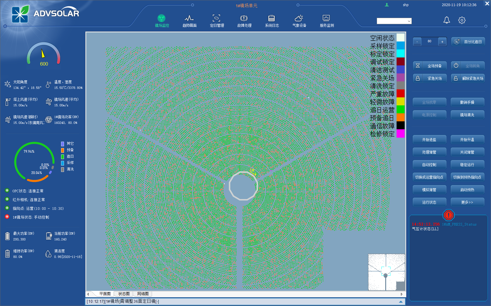 图7展示了监控软件不同的镜子状态。吸热器在光热发电中扮演着核心角色,它需要在高温、高热应力和温度迅速变化的情况下确保安全,并提高吸热器的吸热效率,减少能量和光线的浪费。目前存在大约15%的能量和光线浪费,主要是由多雨的天气引起的。每天太阳落山时,可能会发生各种意外情况,最常见的情况是管道堵塞,因为目前的管道相对较细,大约只有2厘米不到,太阳落山时能量密度较低,熔盐的粘度较大,而温度较低,这使得一小部分盐可能会进入吸热管道内,在第二天的预热过程中会导致堵塞。监控软件可以自动识别管道堵塞的位置,然后自动地进行化盐的处理,逐渐提高能量效率,减少对发电量的影响。